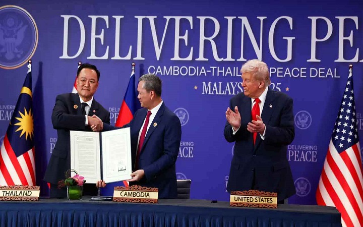 যুক্তরাষ্ট্রের প্রেসিডেন্ট ডোনাল্ড ট্রাম্পের উপস্থিতিতে যুদ্ধবিরতি চুক্তিতে সই করেছে দক্ষিণ-পূর্ব এশিয়ার দুই দেশ থাইল্যান্ড ও কম্বোডিয়া। মালয়েশিয়ায় সই হওয়া এ চুক্তিতে স্বাক্ষর করেন ট্রাস্প নিজেও। মালয়েশিয়ার প্রধানমন্ত্রী আনোয়ার ইব্রাহিমও এসময় উপস্থিতিত ছিলেন। রোববার (২৬ অক্টোবর) এক প্রতিবেদনে এই তথ্য জানিয়েছে বার্তাসংস্থা এএফপি।